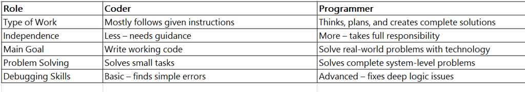 Think of someone planning to open a restaurant. The coder is like the chef who only follows the recipe and cooks food. But the programmer is like the restaurant manager – who decides the menu, buys the ingredients, hires the staff, handles customer complaints, and makes sure everything runs smoothly.