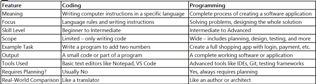 This guide is made for beginners and students who are just starting to learn about computers and software development. Here, we will explain in a simple way what coding and programming mean, how they are different, what skills are needed, and what career paths they can lead to. We’ll also use real-life examples and simple comparisons to make it easy to understand.
